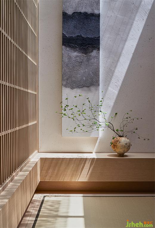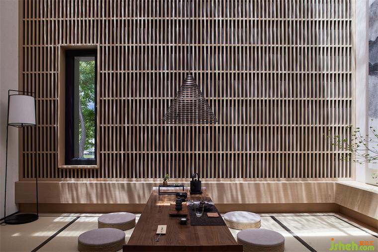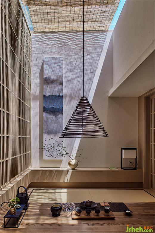 同時(shí),環(huán)繞建筑立面打開5扇縱向條窗,框起室外景致做畫軸上墻。茶空間設(shè)計(jì)無論在室內(nèi)任何角落,自然之光都生機(jī)涌動,它成為空間的基石與精神的寄望,將建筑、人與天地緊緊相連。