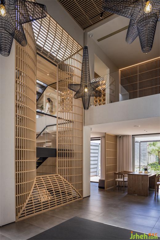 為迎“山光滿幾”,設(shè)計(jì)師將建筑體中央屋面打開,鑿空昔日的昏暗盒子,插入垂直核心筒,容納扶梯。