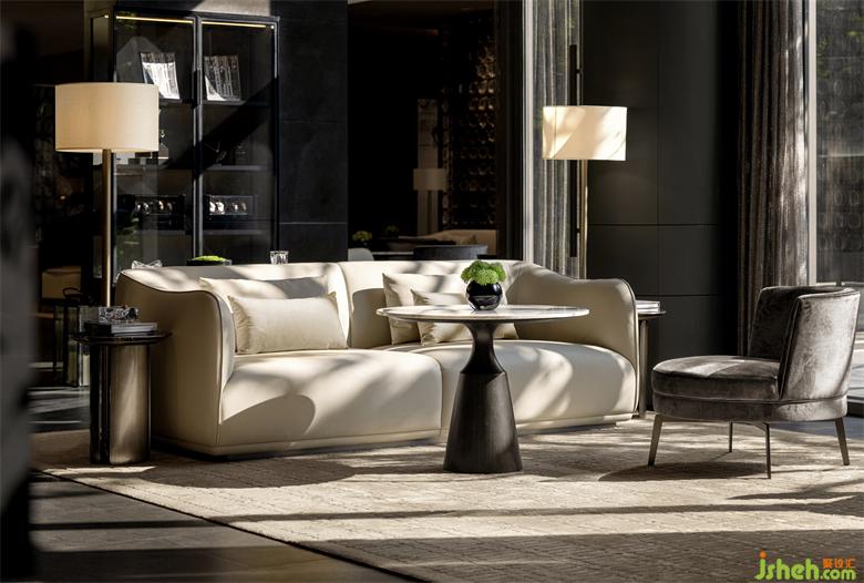 吧臺(tái)一側(cè)的洽談區(qū)軟裝,整體采用與吧臺(tái)相反的淺色調(diào)。售樓處設(shè)計(jì)米白色的沙發(fā)、地毯、茶幾臺(tái)面、落地?zé)?,搭配頂面的弧形線條,共同詮釋著空間中的舒適優(yōu)雅的氛圍。