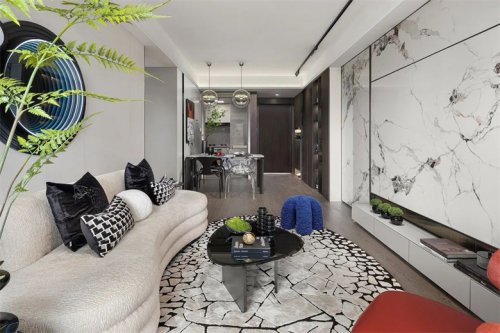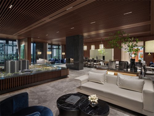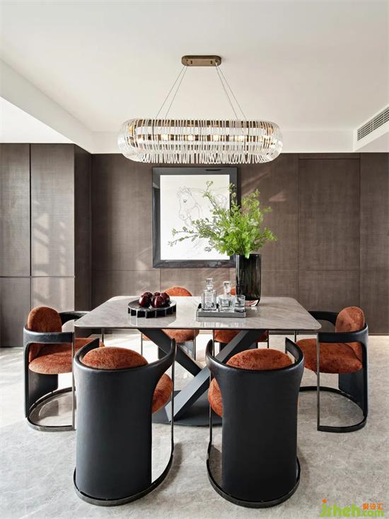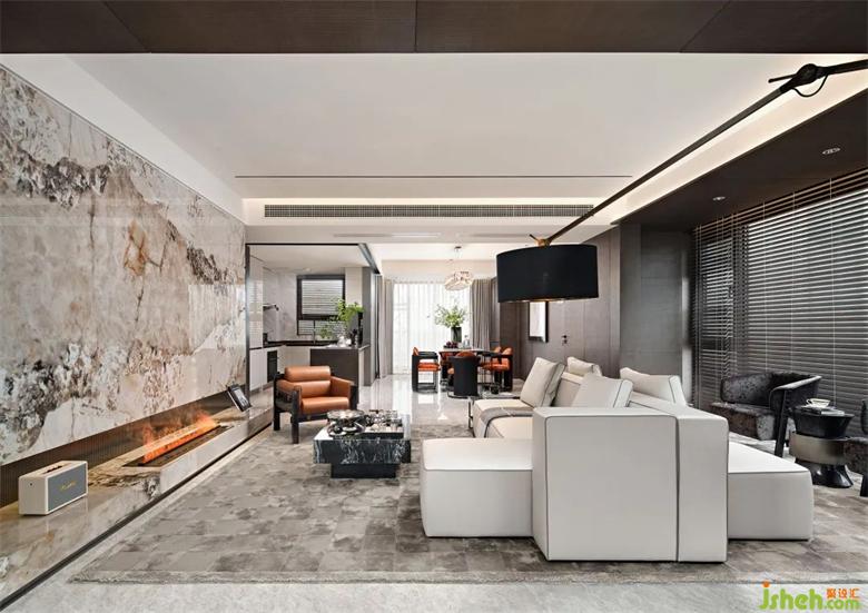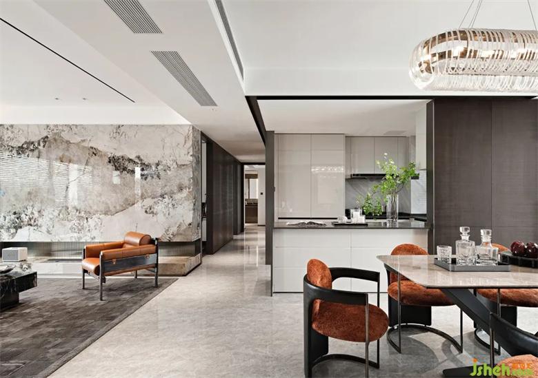大面積暖色花紋的石材,結(jié)合四周簡潔流暢的線條裝飾和中性調(diào)的樣板間設(shè)計家具軟裝,和諧而不繁復(fù)。墻面底部的漂浮結(jié)構(gòu)減去石材墻面的體量感,愛馬仕橙的軟裝點綴增添輕盈明快的優(yōu)雅氣質(zhì)。
