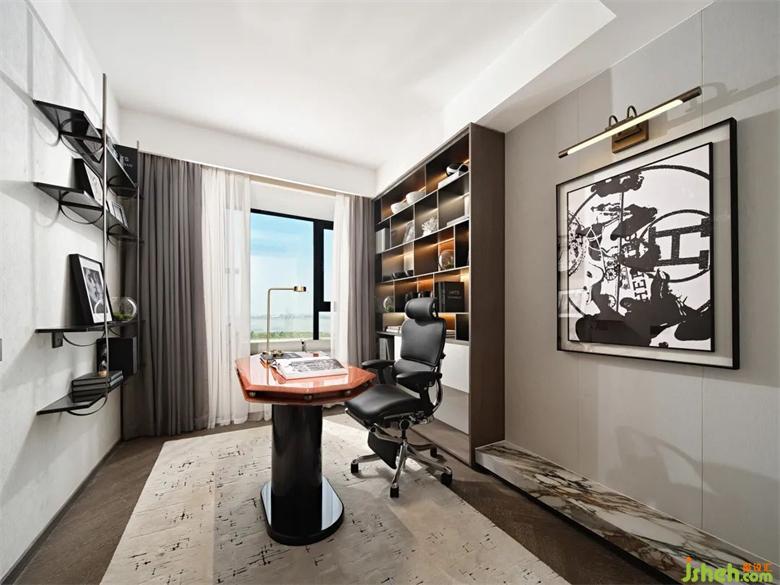 橙色書桌與復(fù)古銅的開放格架,給書房帶來復(fù)古又時尚的氣息,樣板間設(shè)計融合愛馬仕品牌元素的裝飾掛畫,黑白的線條充滿動感,打破空間的沉悶,讓其成為一處靈感的迸發(fā)地。