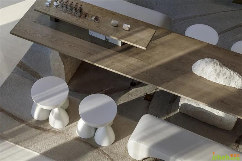 純粹又沉靜的色板構(gòu)筑售樓處設(shè)計空間的寧靜,但也不忘以明亮色著以點綴?!疤斓赜写竺?,萬物有清音”,在這里,美好的事物總是令人向往?;蚴浅两陟o謐中雅聚,或與同伴品茶養(yǎng)性,觀天地,思人生。