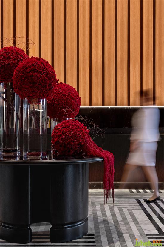 黑白線條交錯的地磚,交替組合的圓形與方形元素,既延續(xù)并重構(gòu)了寶格麗的經(jīng)典圖案,也為大堂整體深色的空間里增添了活躍的層次感,以寶格麗低調(diào)、質(zhì)感的設(shè)計之形建構(gòu)尊貴、舒朗的內(nèi)在體驗及售樓處設(shè)計感受。