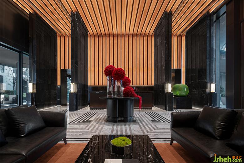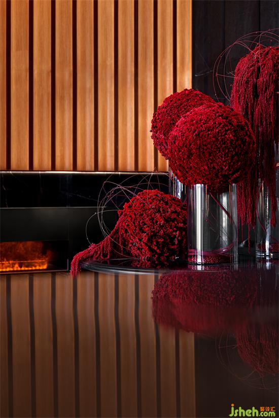 黑色系的墻面與啞光花崗巖、閃耀的燈光、浪漫的壁爐、黑色的真皮沙發(fā),局部點綴跳躍的紅與寶格麗珠寶綠,售樓處設(shè)計以寶格麗酒店的設(shè)計元素與理念精華,呈現(xiàn)意式生活的精致與優(yōu)雅。