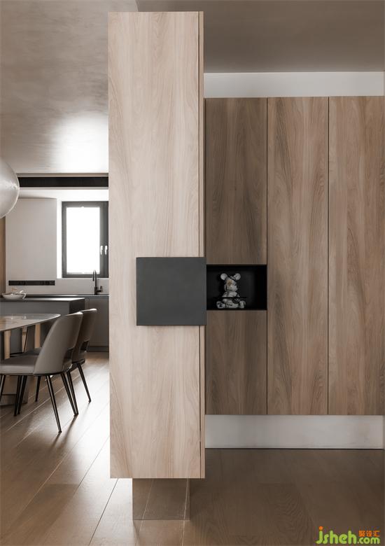 客廳與書房的隔墻中間留有一條縫隙,上設(shè)鋼板連接至?xí)?,讓兩個空間有了互動,鋼板上也能放一些業(yè)主收藏的潮玩手辦,一舉兩得。