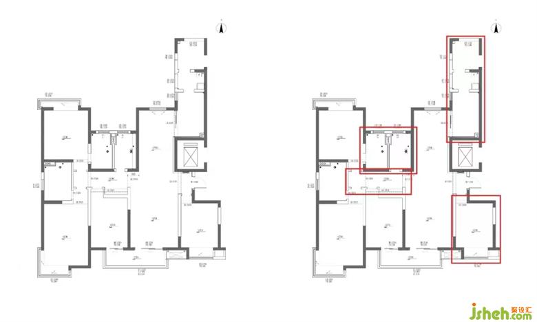原始房型是一個四居室的戶型,由于四人居住,只需保留三間臥室,結(jié)合采光與朝向,南側(cè)次臥不保留,根據(jù)業(yè)主需求重新做規(guī)劃。家裝設(shè)計原始北面臥室套內(nèi)衛(wèi)生間與公共區(qū)域衛(wèi)生間面積都過小,不便于平時起居使用。原始過道區(qū)域也過于狹小,整體動線不舒適。原始廚房區(qū)域比較雞肋,餐廳區(qū)域又太狹長,需重新做布局調(diào)整。