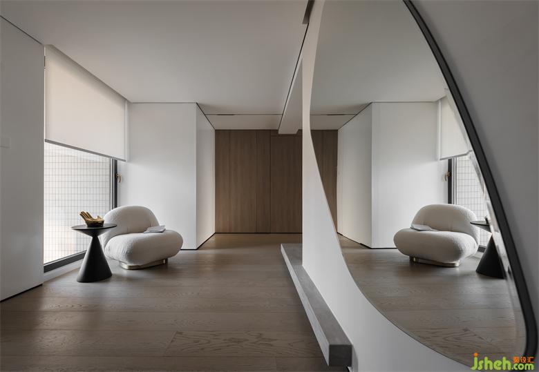 把原始在玄關處的儲藏室面積縮小,分出一個玄關鞋柜,以便進出門換鞋以及放一些隨手物品。異形鏡面的加持,讓整個玄關在木色與白色的交融中多了一份俏皮。家裝設計通過鏡面反射,借用落地窗光線,玄關也變得更加明亮。頂面以大面積白色平鋪,降低視覺上的壓抑感,給人以更開闊的視覺延伸。