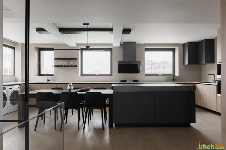 相比餐廚分離式設計,廚房里融入餐廳設計,中西廚可同時烹飪,就餐一氣呵成,優(yōu)化了動線的同時也有了大平層的寬闊感。收納型島臺連接餐桌,家裝設計將儲物與就餐完美結合。U字形的操作臺面與之相結合的下柜,收納空間的提升肉眼可見,摒棄壓縮空間的上柜,在墻面處安置兩個置物架,帶給空間的是輕盈舒適感。