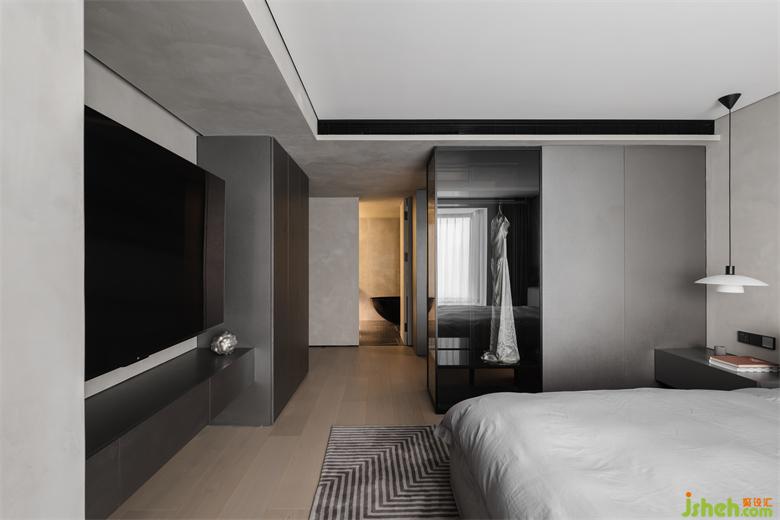 主臥套間在低調與時尚之間尋找平衡,是最具溫度與儀式感的存在。家裝設計進入主臥就能看到設計別致的開放式U型衣帽間,一件高定禮服懸掛于黑色透明區(qū),高級感油然而生。定制的 Ditre Italia 床,床背板連接一側床頭柜,在上面安裝一盞床頭燈,在低飽和度灰調的鋪敘下,帶來了微妙而柔和的空間敘述。