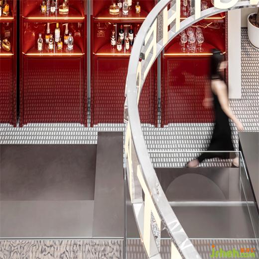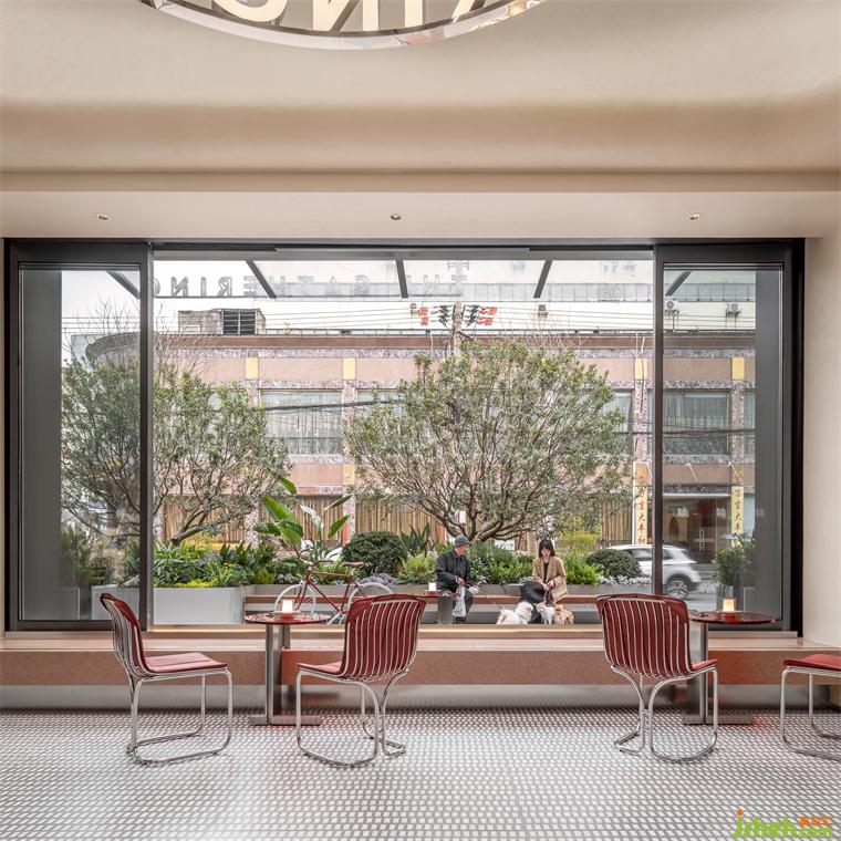 舊建筑的立面與海上和集建筑的開放式立面也展開了新舊對話。海上和集設計擴寬且?guī)в谢壍拇把厝菁{、伴隨并定義了鄰里可以以任何偶然的行為與空間與街道雙向互動。可嵌入軌道自由移動的邊桌,裝修公司采用銀色的時尚工業(yè)風格搭配簡約的紅色圓形玻璃桌面,成為街道的活力元素。