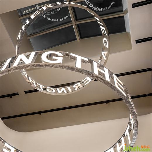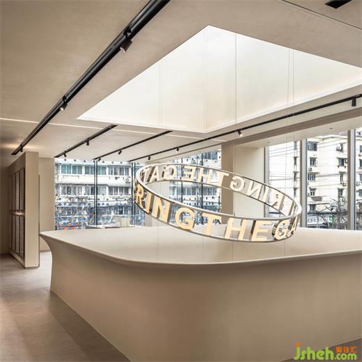設(shè)計(jì)師在一層和二層之間創(chuàng)建了一個(gè)和樓板一體的曲面扶手作為聯(lián)通,海上和集設(shè)計(jì)像是一個(gè)工業(yè)煙囪穿插在樓板之間。巨大的燈光裝置則猶如工業(yè)作業(yè)中白煙,以螺旋形飄向天空,而風(fēng)塑造了燈的造型,輕輕搖曳,宛如天和地、歷史與未來的連接體。