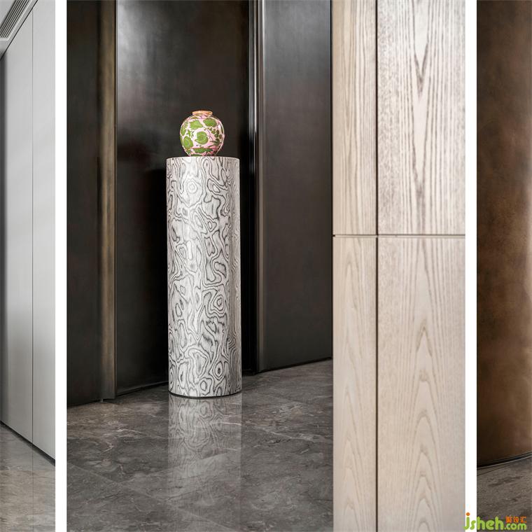 黑色雙門被開啟的瞬間,便仿若進入了神秘主義的畫卷中——挑高的穹頂劃出一雙弧線,籠罩出玄關的所在,立體線條的長案之上擺放著Michael Aram托盤和Klong Tender水滴燭臺,自然元素、古老手作和時尚主義的細節(jié),私人別墅裝修設計透露著居家的品調。