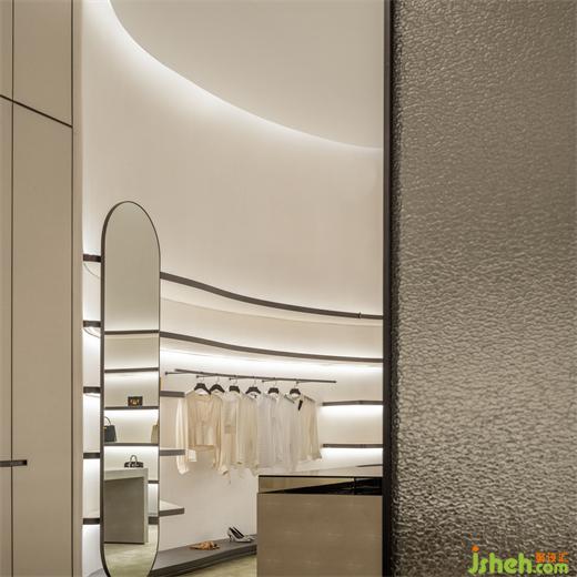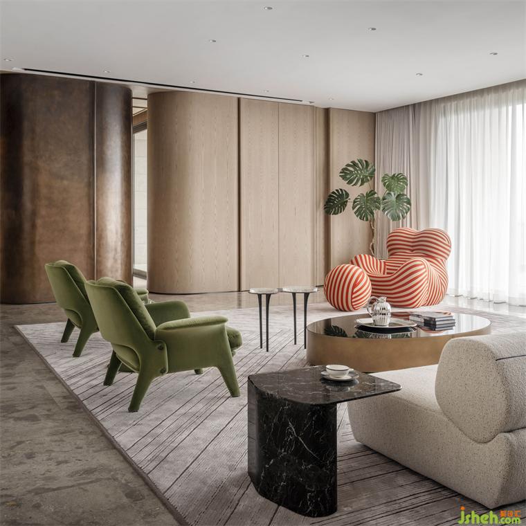 走廊的一側(cè)是獨(dú)立衣帽間的入口,橢圓天花設(shè)計(jì)與弧形擱架,在呼應(yīng)間層層延展開來,溫柔的大地色配以BAXTER毛絨座椅,營(yíng)造華麗松弛的質(zhì)感。