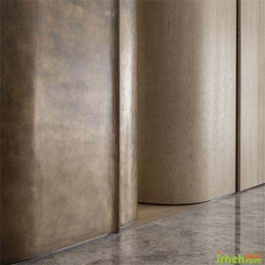 細(xì)致的家宅空間,如音樂般富有節(jié)奏韻律,有聚合之地更有靜處方所。在休閑區(qū)與茶室之間,私人別墅裝修設(shè)計師插入藝術(shù)金屬體塊將兩個功能區(qū)分隔開來,圓弧之上,作有凹凸的線條,仿若雕塑,而體塊背面又兼具著書架的實用功能。