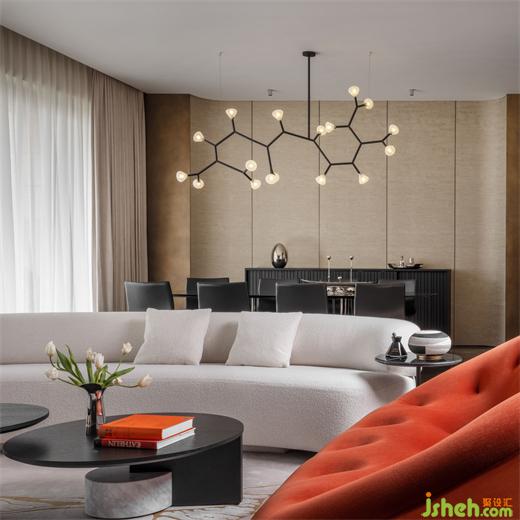 上行一層,抵達(dá)家中的客餐廳,米灰色系為主調(diào),圓形地毯與茶幾圍出親密聚合的意味。Gogan系列長沙發(fā)來自MOROSO,現(xiàn)代感流線設(shè)計與CASSINA單人座椅相應(yīng)和,如同柔軟的雕塑,輕盈有型。私人別墅裝修設(shè)計而Ligne Roset沙發(fā)卻以橘色宣告?zhèn)€性,鳥巢般的造型更平添舒適質(zhì)感。此間MOROSO的金色三腳邊幾以不規(guī)則拼接元素凸顯出自然形態(tài)與設(shè)計美學(xué)的結(jié)合,趣致盎然。Tom Dixon的香氛,更讓家中空氣有跡可循,捕捉五感開啟的確幸。