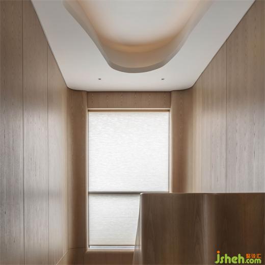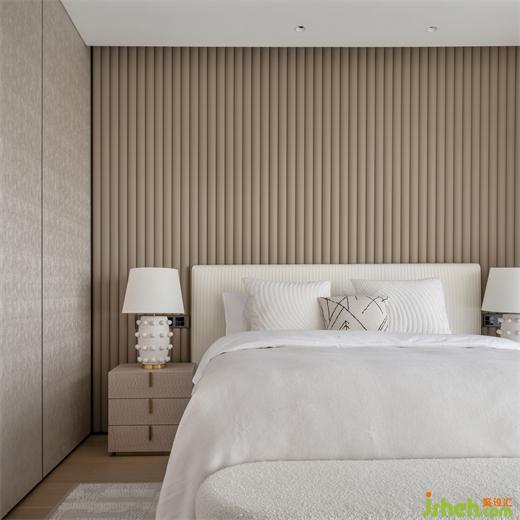 行至二層是臥房區(qū)域,木與白色的主臥空間,頗有美學(xué)中“見白非白,私人別墅裝修設(shè)計白由心生”的境界。立體起伏的背景墻面配以Kelly Wearstler臺燈,底座的雕刻亦在有趣與精致之間形成詼諧對比。