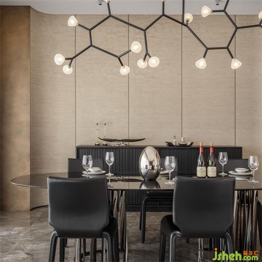 就像這餐廳的黑色餐桌,引用有序的建筑結(jié)構(gòu),基座的纖細金屬條扭曲直立,私人別墅裝修設(shè)計鋁腿的曲折感賦予其雕塑般的外觀。配以同色的ROCHE BOBOIS餐椅、褶皺感邊柜與枝形吊燈,黑色之上,勾勒出家人共處的踏實穩(wěn)妥。