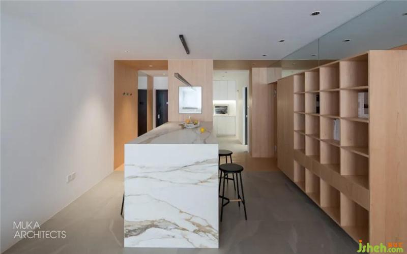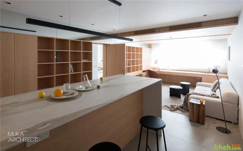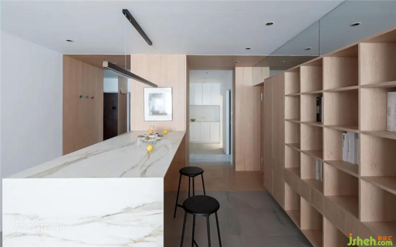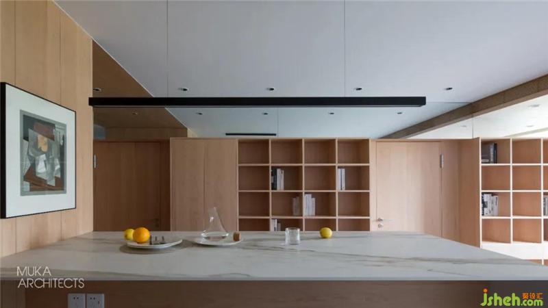 The imported rock slab at the entrance is equipped with a central island for a series of main family activities such as a dining table, a bar, reading work, and future living activities. It is the visual center, and the perfect connection with the maple box No. 1 has become a good migration Moving line.