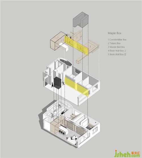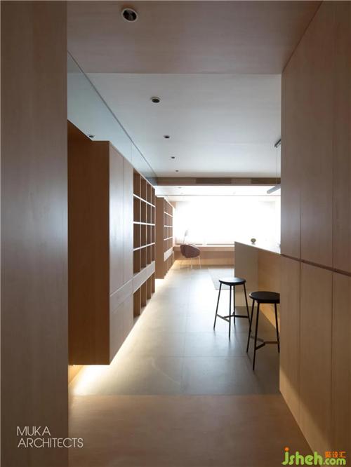 The No. 1 maple box is located at the entrance hallway. The hallway space is separated by the wood veneer of the ceiling, floor and wall, and the storage function is integrated, which serves as the center of movement.