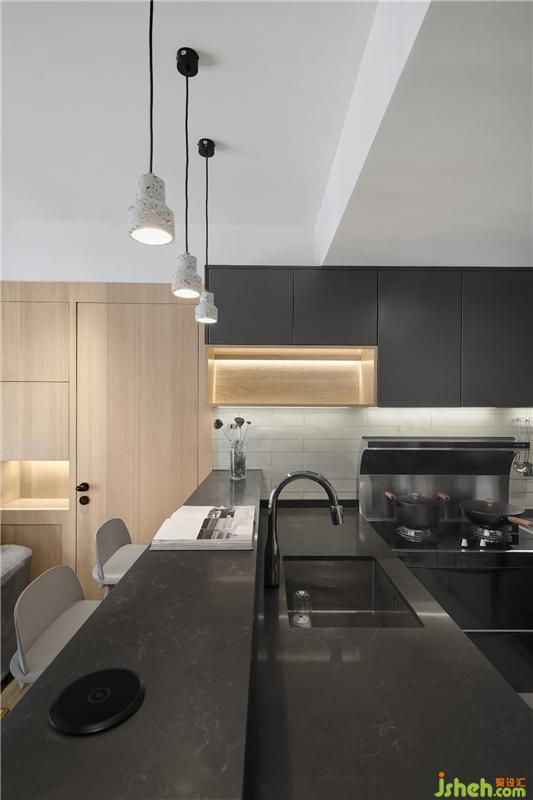 ▲餐廳吧臺(tái)和灶臺(tái)一體式設(shè)計(jì),便于交流溝通。吧臺(tái)的電動(dòng)升降插座,支持無(wú)線藍(lán)牙充電。