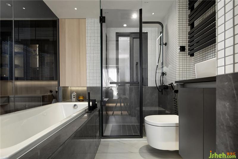 衛(wèi)生間作為一個獨立的盒子設(shè)計,打破傳統(tǒng)的隔墻,改為黑色玻璃,強化區(qū)域界線的同時,也提供了視線交流的可能性,不同空間呈現(xiàn)出不同的生活情境,且能夠視線無遮擋的交流溝通。半通透的黑色玻璃,方便清潔的同時,讓衛(wèi)生間增加了一絲神秘感和情趣!