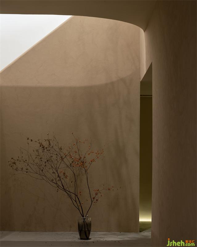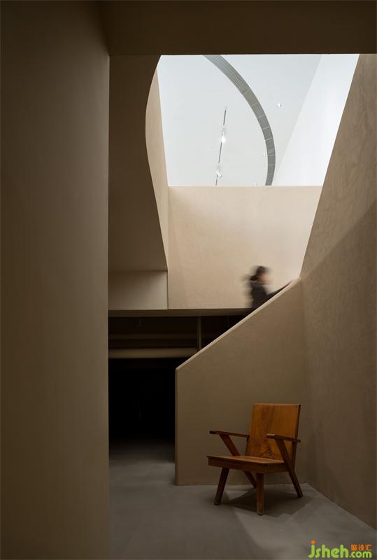 土黃色的藝術(shù)涂料包裹著樓梯空間,宛如從地面生長出來,展廳設(shè)計曲面的造型讓粗獷的墻面柔和了許多,在光影作用下,如雕塑搬的存在。