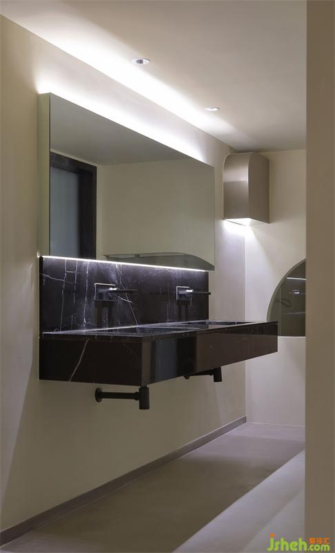 衛(wèi)生間黑色的大理石臺面和環(huán)境形成強烈的材質(zhì)對比,強化它的存在感。