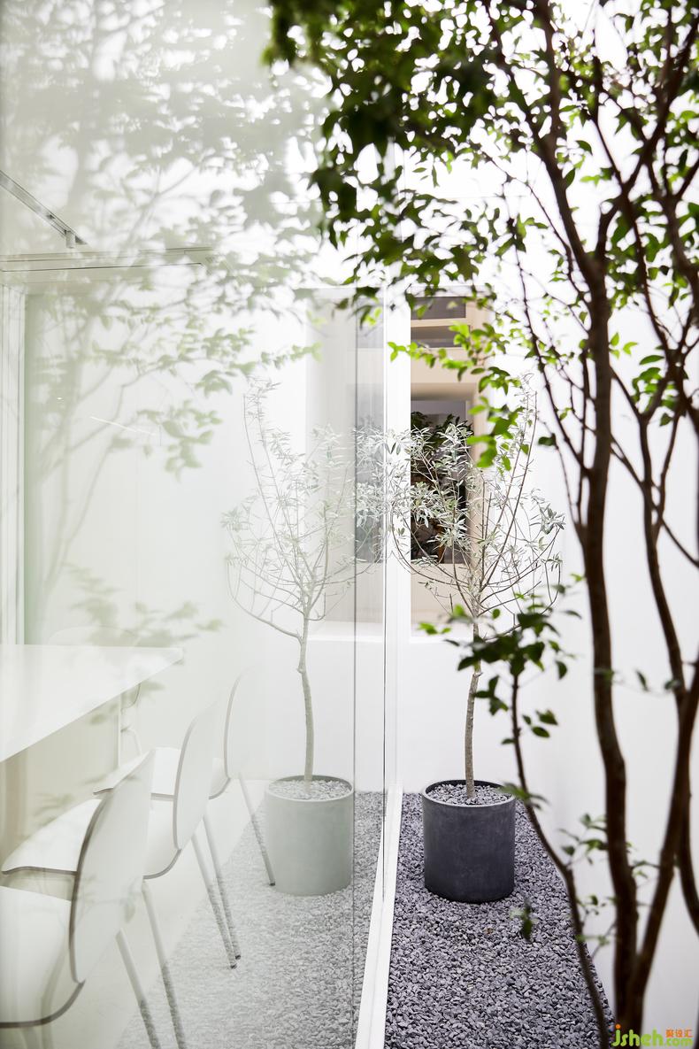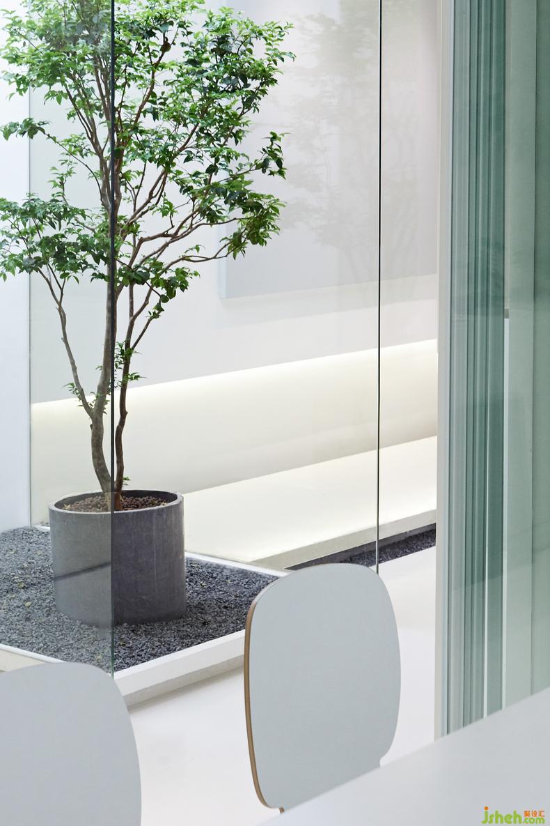 通往二層的樓梯輕薄而有力,二層辦公區(qū)與一層有“天井”相連,辦公室設(shè)計(jì)通過這部分灰空間感受原始的舊空間生長的植物貫穿上下,空氣在其縫隙中自由流通,空間模糊了室內(nèi)外,空間間隙處的景觀空間成為了原始空間的“意義上的外部”。