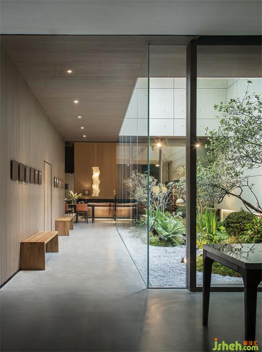 多個空間圍繞同一處景觀不同的取景方式,暗示了不同空間及其中家居各異的風格調(diào)性。為了使室內(nèi)空間均質(zhì)化,目心設計在不同風格房間中使用一致的材料來營造出純粹的空間氛圍。為了消除現(xiàn)代混凝土帶來的冰冷感,設計師利用燈光散發(fā)出柔和協(xié)調(diào)的光芒,呼應了空間氛圍。