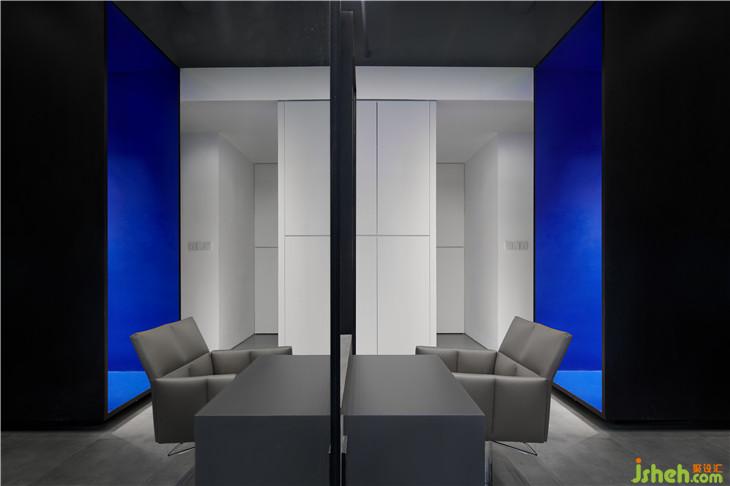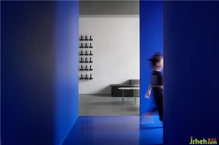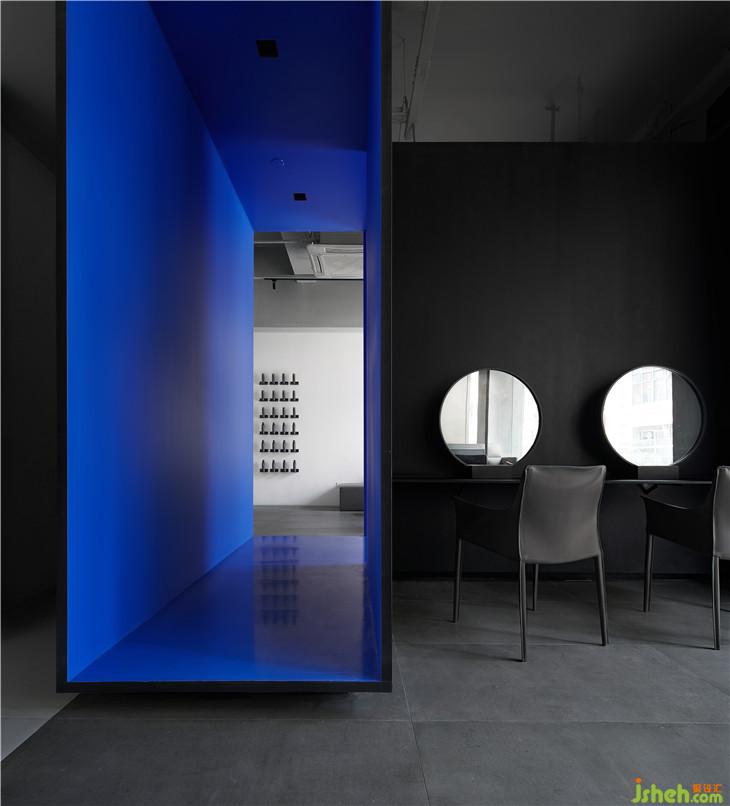 設(shè)計(jì)師在洗、剪區(qū)域之間的墻體下方預(yù)留了五個洞孔,室外的光線能夠不動聲色地進(jìn)入洗發(fā)區(qū),后經(jīng)克萊因藍(lán)的過濾,輕薄光線在黑暗中交疊、滲透,引導(dǎo)客人行徑之余竟有一種欲說還休的美。