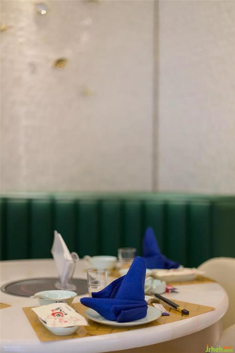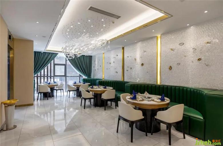 天然祖母綠作為卡座區(qū)的主色調(diào),這一白色與綠色的混合體,蘊(yùn)含明晰的純粹之感,更具有視覺上的沖擊力。綠色亦契合本案飲食的自然新鮮理念,屋頂上晶瑩剔透的魚兒,以活潑靈動(dòng)的象征意義賦予場(chǎng)景空間新的生命力。