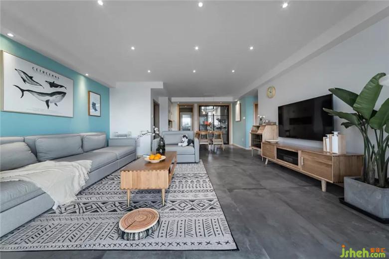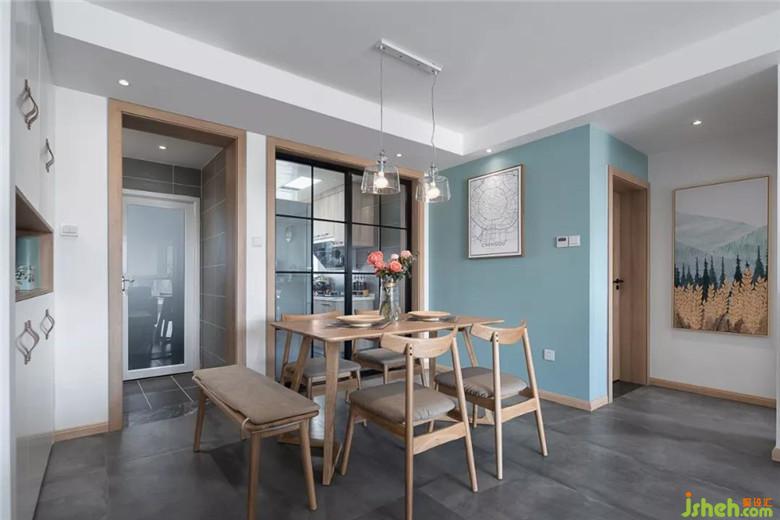 發(fā)背景墻和餐廳墻顏色相呼應(yīng),這個(gè)顏色比大海淺一點(diǎn),蒂凡尼藍(lán)在這個(gè)空間顯得有點(diǎn)小清新。向往大海的自由,那就來(lái)一組鯊魚(yú)的掛畫(huà),讓整個(gè)空間靈動(dòng)起來(lái)。
