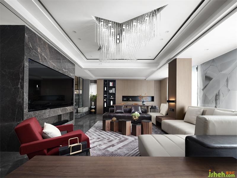 在客廳區(qū)域,搭配特別定制的水晶燈(寓意璀璨之星),根據(jù)現(xiàn)場(chǎng)空間定制的沙發(fā)、有趣的茶幾,黑白相間的藝術(shù)掛畫、極具沖擊力的機(jī)器人椅子,詮釋著空間的美學(xué)尺度。