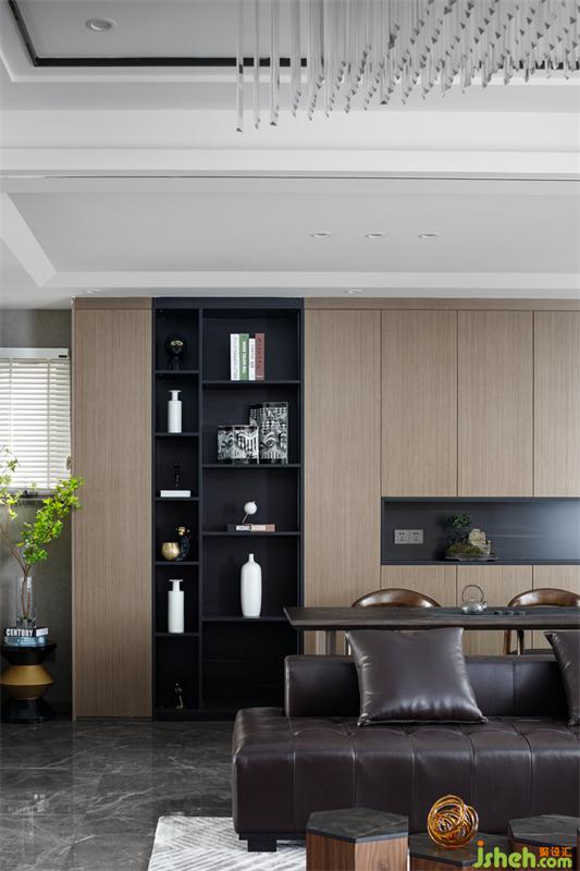 考慮家里老人爬樓不方便,一樓入戶靠右留有一個房間做老人房,離衛(wèi)生間也近。除去一個房間后,客廳的使用面積接近40㎡左右。我們在客廳的一邊設(shè)計了品茶區(qū),環(huán)繞型的布局思路,將空間尺度、功能及實用性無限延伸。