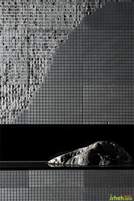 當(dāng)陽光漫入空間,光影斑駁,有時令空間的一切界限分明,偶爾又界限模糊,詩意地與自然呼應(yīng)共生。在玻璃造景里,設(shè)計師還設(shè)計了一個隱形門,可以檢修客廳電視,客廳電視也有個特殊支架,可以拉動電視調(diào)整觀影方向。