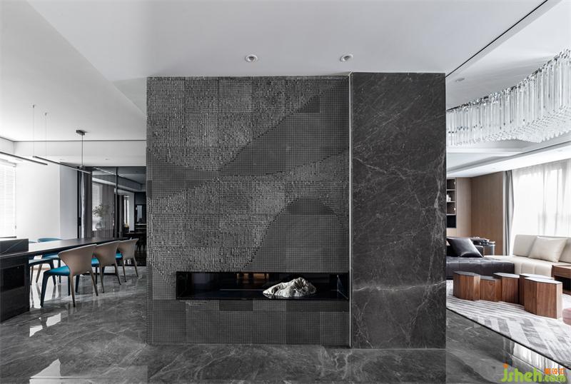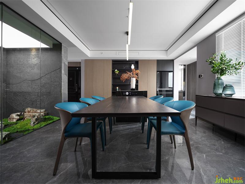 穿行至餐廳,西廚島臺和餐桌共為一體,展開在石影木色中,以自然的紋理、材質(zhì)、線性燈飾點綴修飾,呈現(xiàn)當(dāng)代空間功能整合、美學(xué)并敘的開放式格局。