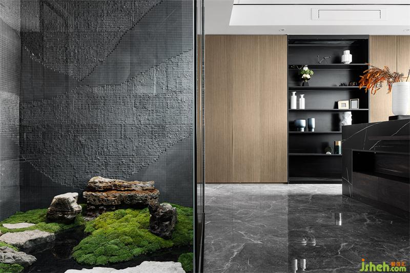 取消掉原玄關(guān)處的儲物間,連接客餐廳,使整個空間更加通透靈動。作為連接客餐廳的中心樞紐,我們選擇在此處造景,同時也解決了此處大方柱的突兀。原設(shè)計做了樹,因風(fēng)水原因改成了太湖石和烘干的苔蘚,綠意濃濃,生機勃勃。