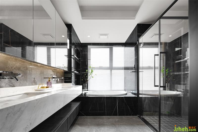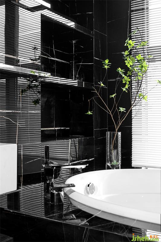 衛(wèi)浴間墻面選用亮面黑色瓷磚,沉穩(wěn)不失優(yōu)雅大氣。窗邊潔白的浴缸,當(dāng)黑白的經(jīng)典搭配,融入現(xiàn)代生活的精致與優(yōu)雅,不浮躁,亦不平庸。