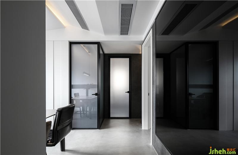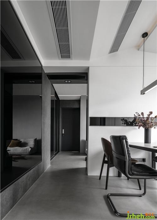 圖中走廊的右邊是黑色玻璃,盡頭是衛(wèi)生間,衛(wèi)生間的門是長虹玻璃門,長虹玻璃通透,透光不透視,可以制造明亮的視覺效果,特別是當(dāng)光打在上面有一種朦朧的美感,配合極窄細(xì)邊框,可以讓空間顯得更大更簡約。衛(wèi)生間的左邊是次臥,次臥的墻體和門采用了玻璃門的樣式,使得其與衛(wèi)生間渾然一體,空間的整體色調(diào)一致。