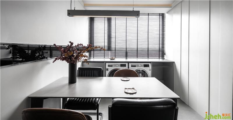 白色的巖板餐桌,巖板的材質(zhì)顯得比較輕盈,搭配皮面餐椅,一雙黑色搭配另一雙棕色的皮面餐椅,搭配枯色的花藝,與整體色調(diào)相統(tǒng)一。