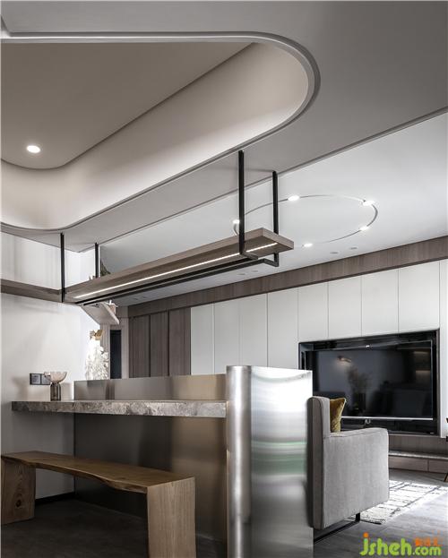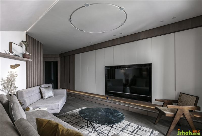 中間內(nèi)嵌電視,整面墻的收納空間,這個(gè)空間的面積實(shí)用做到了最大??蛷d的吊頂做了一個(gè)圓形的造型,在一絲不茍中透露一點(diǎn)小俏皮。