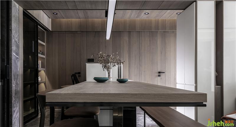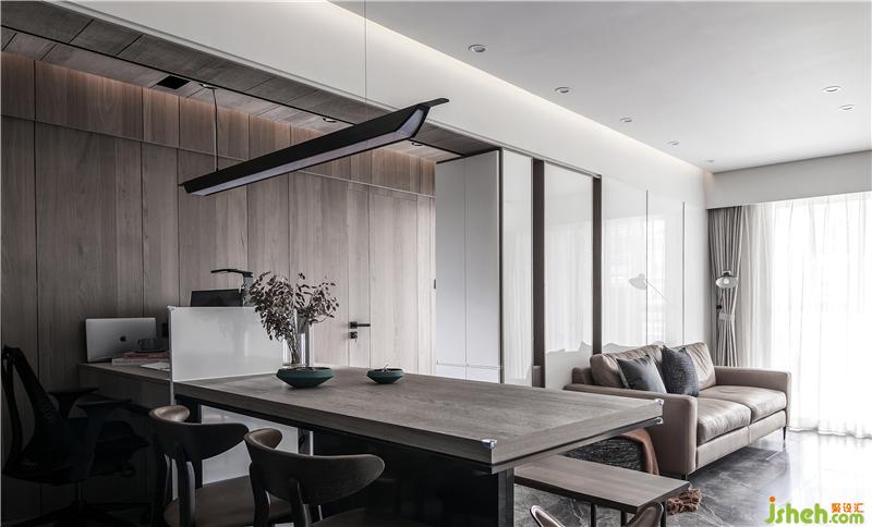 餐廳的整體背景為木色,一整面的木飾面,做了隱形門的設(shè)計(jì),避免了過(guò)道小區(qū)域的空間碎片化,將次臥的門以及衛(wèi)生間的門很好的隱藏起來(lái)了。在餐桌旁邊是書桌,以白色的高擋邊區(qū)分開兩個(gè)分區(qū)。在書桌后面是一整面的書柜,是實(shí)木層板與深色玻璃組成,柜體材質(zhì)為實(shí)木,推拉玻璃門給人很強(qiáng)的高級(jí)感,為空間帶來(lái)寬敞的通透質(zhì)感,采用的是一門到頂?shù)脑O(shè)計(jì)。