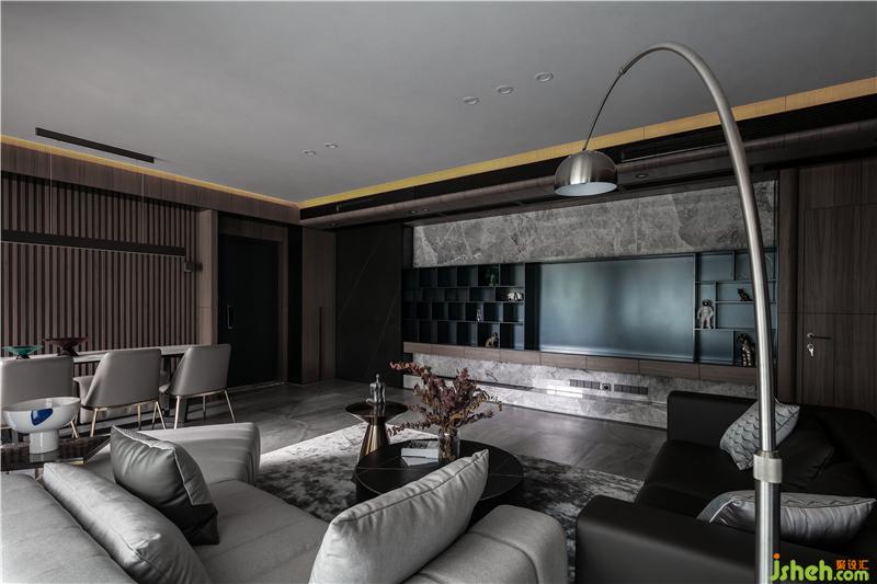 電視背景墻為白底灰紋的大理石臺面,下方為250mm高的抬高,用于放置機(jī)頂盒和音響。電視下是木飾面的層板,兩側(cè)用黑色不銹鋼收邊,冷色與暖色的碰撞,室內(nèi)設(shè)計(jì)師以沉穩(wěn)的黑色作為白色與木色之間的分界,既為效果做緩沖,也使空間更有整體性。