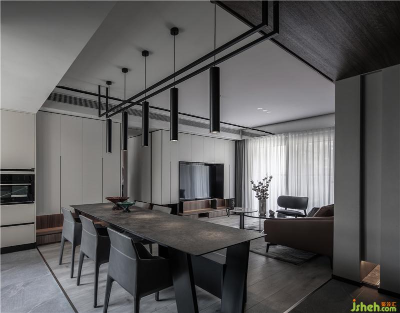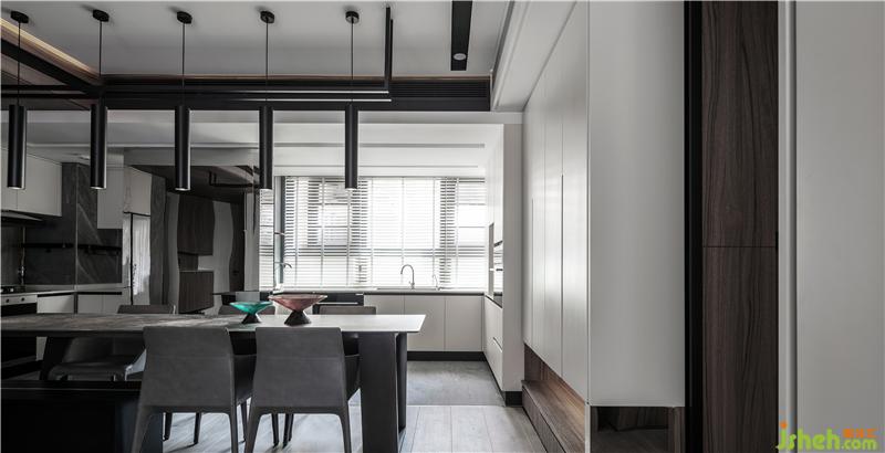The material of dining table is black rock plate and black steel, the dining chair with thin legs and bench, several long chandeliers above. Can satisfy 6 people dining at most, the moving line space around is fluent. In and kitchen, porch boundary also uses to close the border to distinguish, the kitchen and porch uses is the gray floor tile, the living room dining room uses is the wooden floor. The overall tone is unified, showing high-level atmosphere.