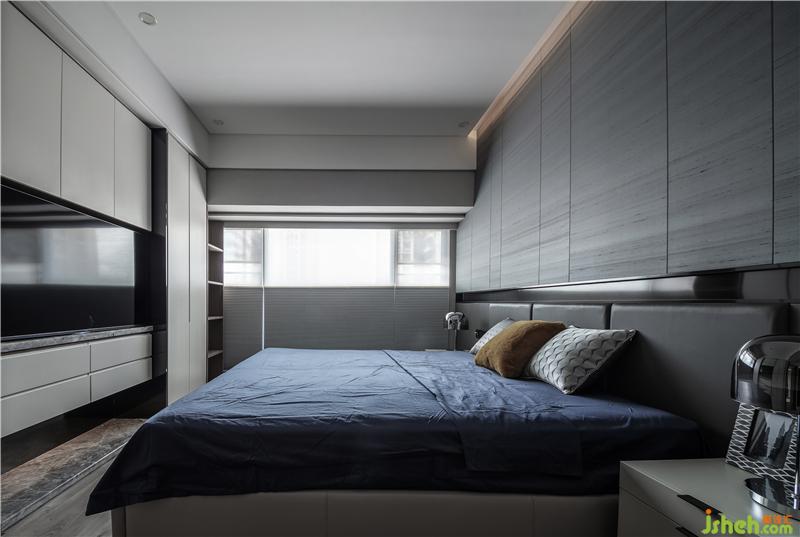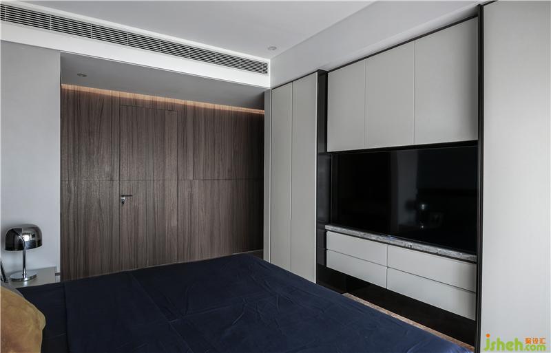 主臥的電視背景墻為一排白色烤漆板的柜子,增加了收納空間。
