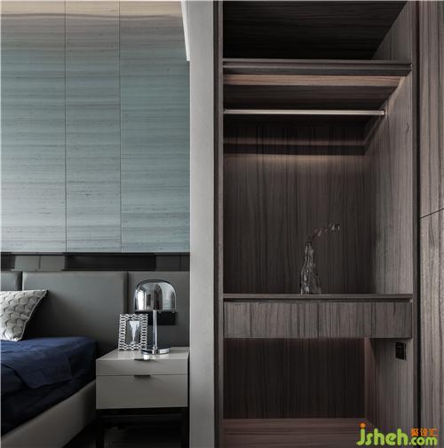 床頭一側(cè)設(shè)置了開放式的木飾面的衣柜,用來平時業(yè)主掛衣或者是一些物品收納。
