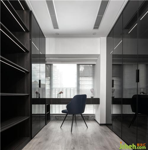 業(yè)主家喜歡藍色,并且要求主臥的床越大越好。我們以深灰色的基調(diào)搭配木地板,鋪以燈光制造氛圍,深色系的臥室更能讓人進入睡眠狀態(tài)。床頭背景墻軟包與硬包相結(jié)合,中間為不銹鋼。透露了一絲精致感。