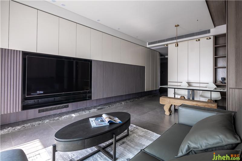 電視背景墻上面白色的是烤漆柜門(可儲(chǔ)物),下面是現(xiàn)場人工制作的,也是柜門,具有儲(chǔ)物功能。右邊黑色部分是展示柜,用的是黑色不銹鋼,里面暗藏?zé)魩А?