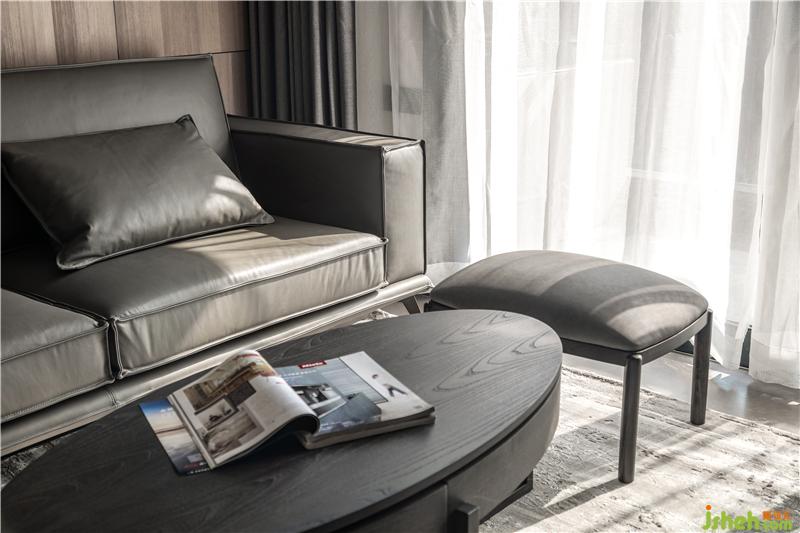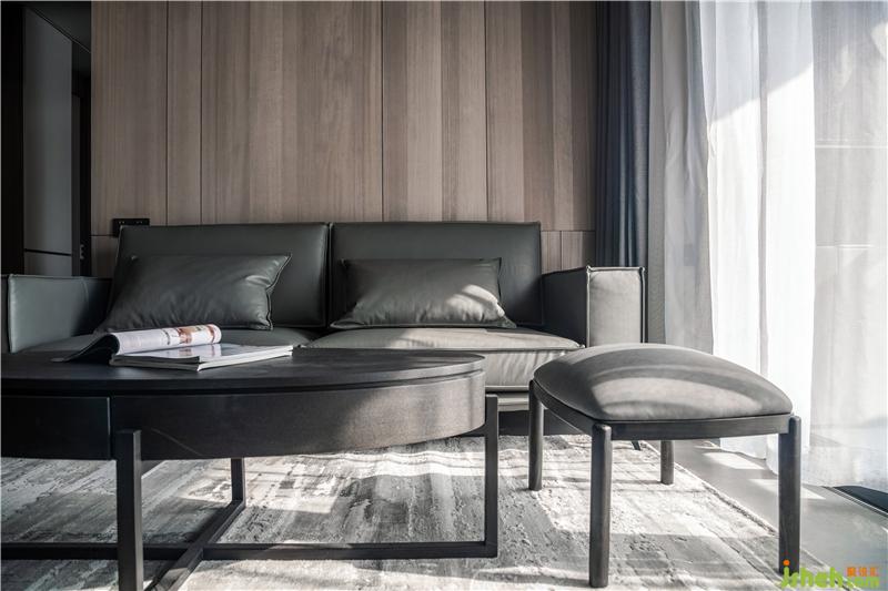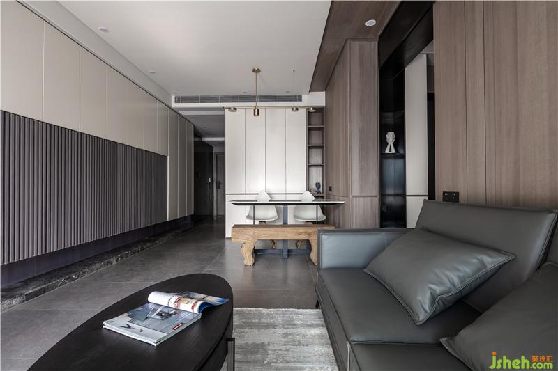 材質(zhì):木飾面、烤漆柜門、皮質(zhì)沙發(fā)、不銹鋼、瓷磚、科定板、木質(zhì)茶幾、不銹鋼、雙層窗簾