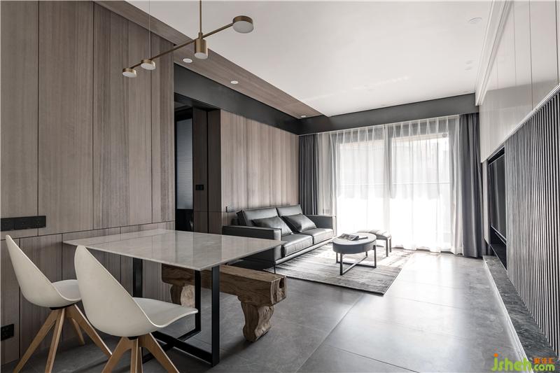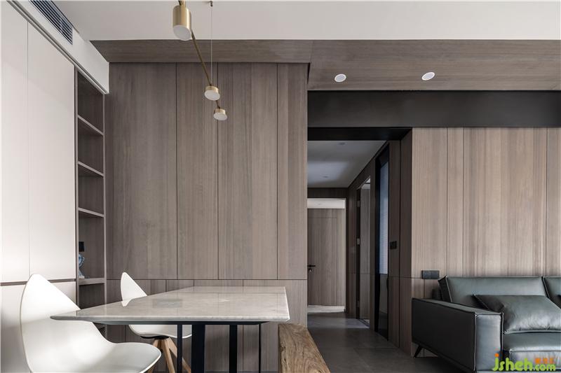 材質(zhì):木飾面、超薄筒燈、大理石餐桌、烤漆門